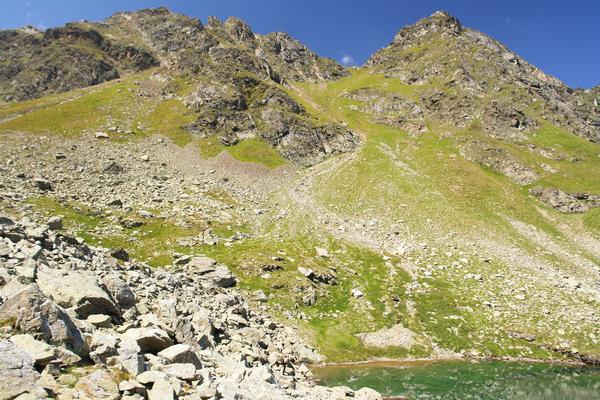 Bei der Schlüsselstelle der Tour - dem Übergang vom Wildkar ins Herzmaierkar - wartete jetzt ein sehr steiler Anstieg in die Scharte zwischen Wasserfallspitze und Hinteren Wildkarstein.