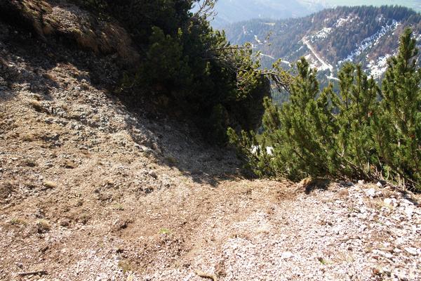 Zumindest einen kurzen Abschnitt ist Trittsicherheit aber unbedingt erforderlich. Sehr steil würde es am schottrigen Hang hinunter gehen.