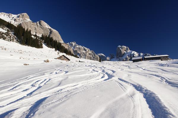 Viele Schispuren führen an den Wiesenhängen talwärts.