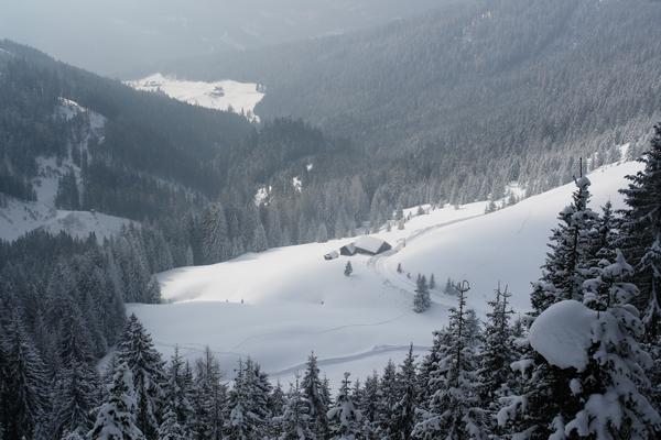 Tiefblick zur Arzbergalm und hinaus auf die freien Wiesenflächen unweit des Ausgangsortes
