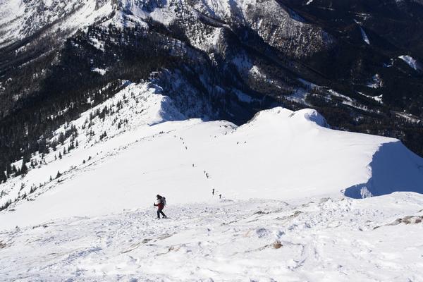 Während wir absteigen, kommt die große Schitourengehergruppe in langer Reihe aufgefädelt, den Gipfel herauf.
