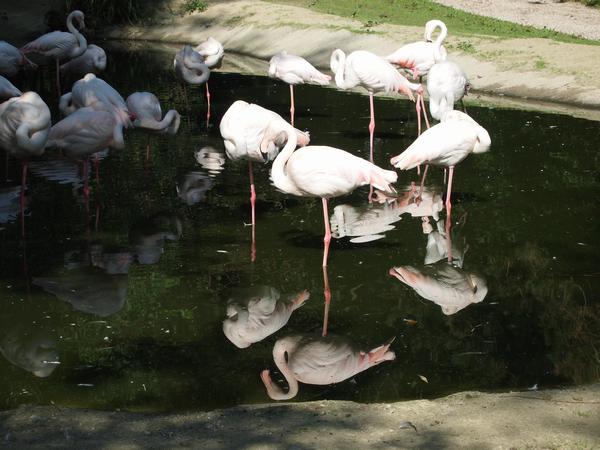 Einbeinige Flamingos beim Fußbad