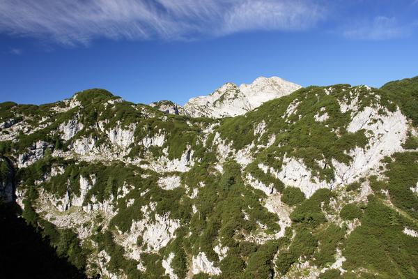 Danach mache ich mich auf den Weg zum nächsten Gipfelziel, dem unscheinbaren, latschenbewachsenen Kleinen Göll (rechts).