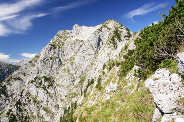 Am Rande der Latschen führt die Route oberhalb steil abschüssiger Hänge am Grat entlang.