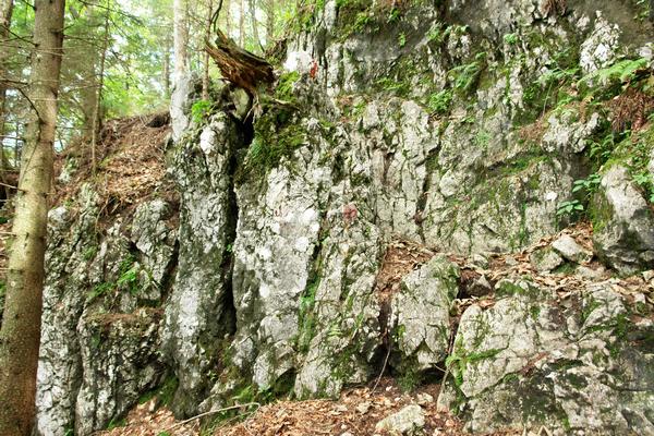 Einige Male muß ich im Steilwald ordentlich aufpassen, am schlammigen Boden nicht ins Rutschen zu kommen. Im Großen und Ganzen läßt sich das Steiglein aber gut begehen, nur selten bilden Felsplatten eine kleine Barriere.