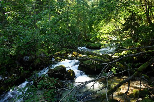 Zurück beim Abfluß des Gollinger Wasserfalles, der jetzt am warmen Nachmittag von zahlreichen Besuchern bevölkert wird.