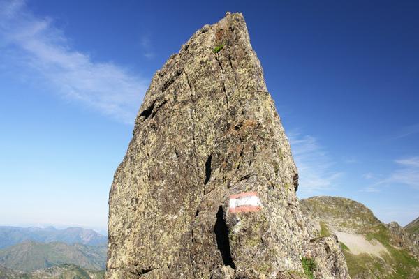 Der anspruchsvollste und felsige Abschnitt des Dreisteckengrats, mit einigen Klettereinlagen im untersten Schwierigkeitsbereich, befindet sich zwischen Großem Bösenstein und Sonntagskarspitze.