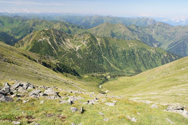 Blick nach Westen über die Rottenmanner und Wölzer Tauern bis zu den Schladminger Tauern. Rechts hinten sind die schneebedeckten Dachsteingipfel erkennbar.