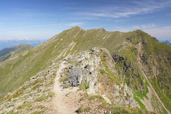 ... gehts noch einmal hinauf auf den dreigipfeligen III-Stecken. Zunächst in einigen Serpentinen auf die Erhebung ganz rechts und dann oben am Kamm zum Hauptgipfel (links).