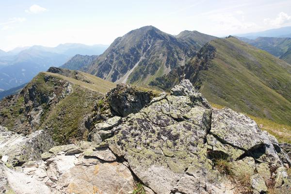 Blick nach Süden. Links die Dreistecken-Nachbargipfel, rechts die Sonntagskarspitze, oberhalb der Bildmitte der Große Bösenstein, rechts dahinter der Kleine Bösenstein.