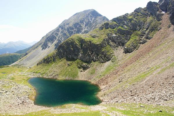 Ich verlasse den Wanderweg dort, wo er einen "Knick" nach unten zum See macht und quere stattdessen geradeaus weiter in die steile Wiesenflanke, die mich in der Folge auf den ...