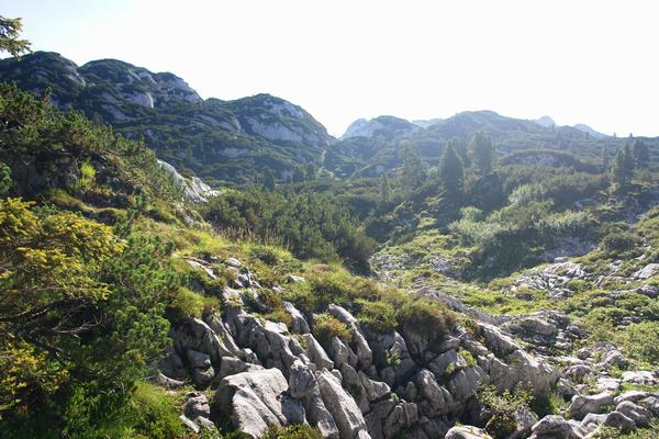 Gegen Westen steigt das Gelände noch einmal an, ehe wir durch eine Latschengasse (oberhalb der Bildmitte) ...