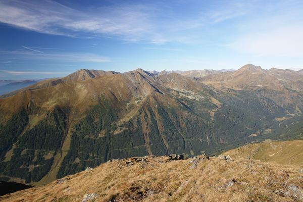 Blick auf den westlich benachbarten Höhenrücken, der sich vom Langhauseck über das Stangeneck nach Norden zur Schoberspitze (ganz rechts) zieht. Dahinter die beiden höchsten Gipfel der Rottenmanner und Wölzer Tauern: Greim und Rettelkirchspitze.