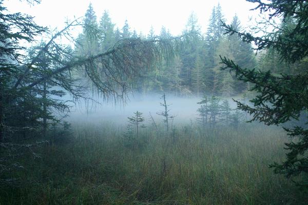 Die Wandermarkierung führt uns an mystisch umnebelten Waldlichtungen vorbei ...