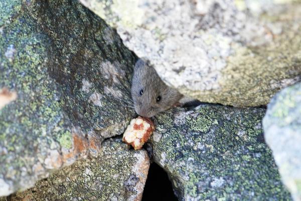 | Aus den Augenwinkeln bemerkte ich, wie die kurz zur Seite gelegte Bananenschale immer wieder eigenmächtige Bewegungen veranstaltete. Zunächst glaubte ich an den Wind, als ich mir damit die “Zuckungen” aber nicht mehr erklären konnte, sah ich mir die Löcher im Steinwall genauer an. Und siehe da – eine kleine, posierliche Maus leistete uns Gesellschaft bei unserer Gipfelrast. Um den kleinen Frechdachs erstens aus der Reserve und zweitens aus einem der vielen Löcher zu locken, legte ich ihm Köder aus. Einmal von oben ... |