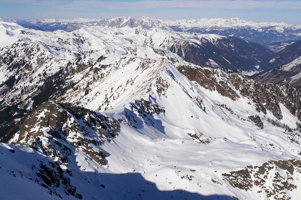Im Norden wirken Hochrotwand und Wolfnalmspitze recht unscheinbar. Oberhalb der Bildmitte im Hintergrund der Grimming, rechts hinten das Tote Gebirge.
