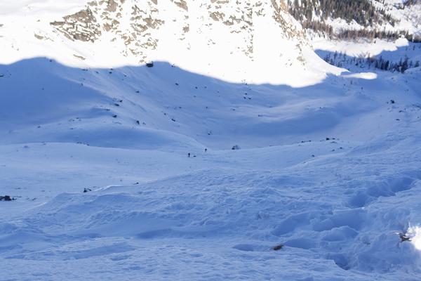 Unter mir - im Steilhang - werden die Stimmen der 2 nachfolgenden Schitourengeher allmählich lauter. Noch aber haben sie einen mühsamen Weg vor sich (unterhalb der Bildmitte).
