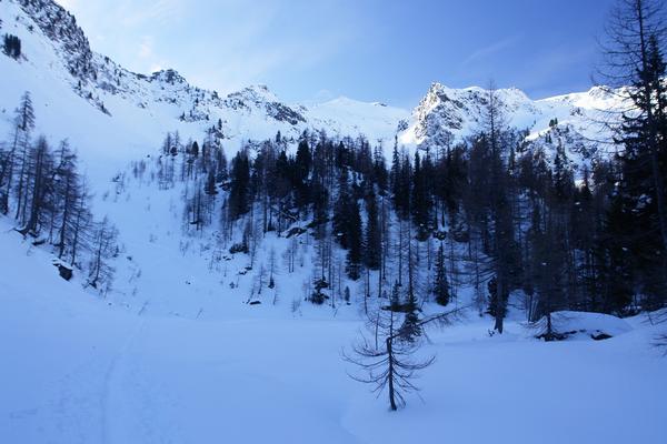 Weiter geht´s über den linken, baumfreien Hang - ein kurzes Stück über einen Lawinenkegel, der von der linken Seite herunter gekommen ist.