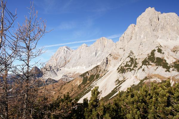 Aber warum denn in die Ferne schweifen, wenn das Schöne liegt so nah: Das Dachstein-Dreigestirn "Torstein - Mitterspitz - Hoher Dachstein"