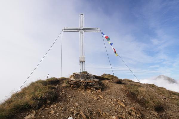 Es dauert nicht mehr lange und ich stehe beim Gipfelkreuz am Kleinhansl, wo ich mich in Anbetracht der noch vor mir liegenden weiten Wanderdistanz und des kühlen Windes aber nicht lange aufhalte.