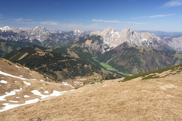 Ausblick hinunter in das Ausgangsgebiet der Eisenzer Ramsau (rechts der Bildmitte). Darüber Kaiserschild und Hochkogel (27.07.2008). Weiter links der Lugauer über Radmer (Überschreitung am 07.10.2006).