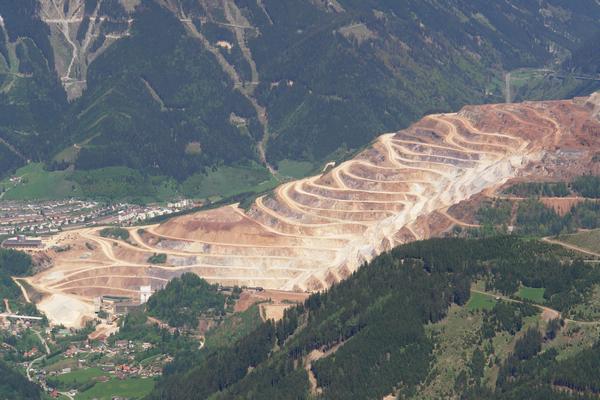 ... mit den tief in den Erzberg gegrabenen Furchen.