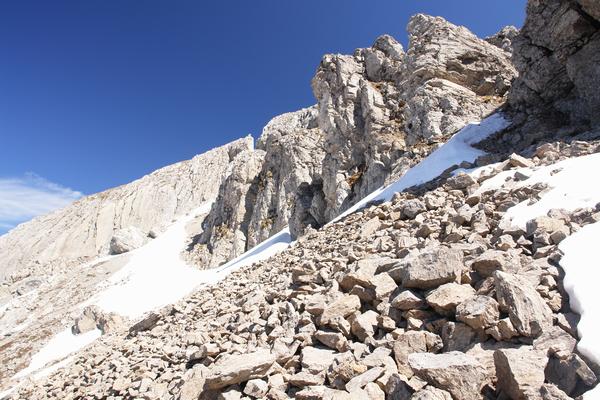 Im steinigen Gelände gilt es, letzte Schneefelder zu queren.
