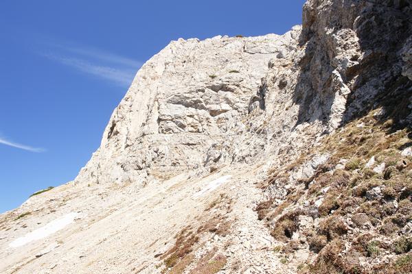Ein einfacher Steig will sich mir aber auf den ersten Blick nicht erschließen und so mache ich unter den schroffen Felswänden westlich unterhalb des Gipfelkreuzes wieder kehrt.