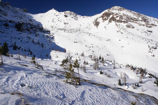 Und südwestlich vor uns das weite, eindrucksvolle Kar welches sich am Speikkogel (rechts) vorbei bis zur Lackenspitze (links) hinaufzieht.