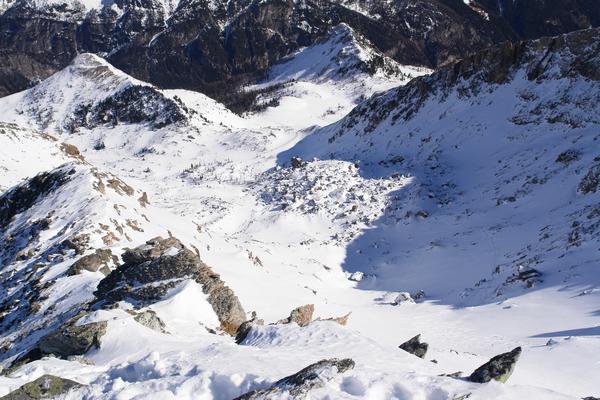 Das weite Kar bis zum Rosskogel (links). Oberhalb der Bildmitte der Sattel mit der kleinen Jagdhütte. Von der anderen Seite sind wir herauf gekommen.