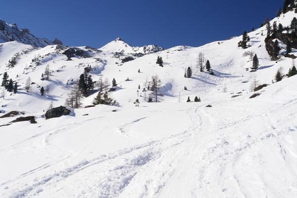 Dann fahren wir bei verschiedenartigen, abwechslungsreichen, meist ganz passablen Schneearten zurück in den schattigen Wald unterhalb des Wildalmsees, wo wir auf guten Pulverschnee treffen.