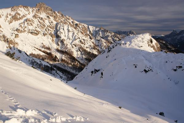 Auf die letzten 70 Höhenmeter auf den Mühlauer Stadel mussten wir angesichts der bereits vorgerückten Stunde aber verzichten. Stattdessen hielten wir nun ostwärts auf eine Steilstufe zu (nach der Scharte links unten).
