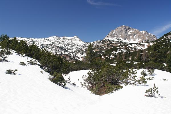 | Bald aber gibt es immer wieder hartnäckige Latschenfelder und apere Stellen, die das Vorwärtskommen mit Schneeschuhen schwierig gestalten. Legt man die Schneeschuhe aber ab, wartet mit Sicherheit hinter dem nächsten Gebüsch ein Schneefeld, durch welches man tief ins Unterholz einbricht. |