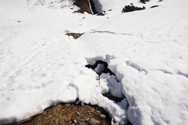 | ... und nachdem ich nach meinem Sturz noch einige weitere Male im weichen Schnee eingebrochen bin, "gelingt" mir dieses abschließend noch einmal in ein schadenfroh gurgelndes Bächlein. Gottseidank ist es heute sehr warm und spätestens bei der Ankunft im Tal sollte ich wieder trocken sein. |