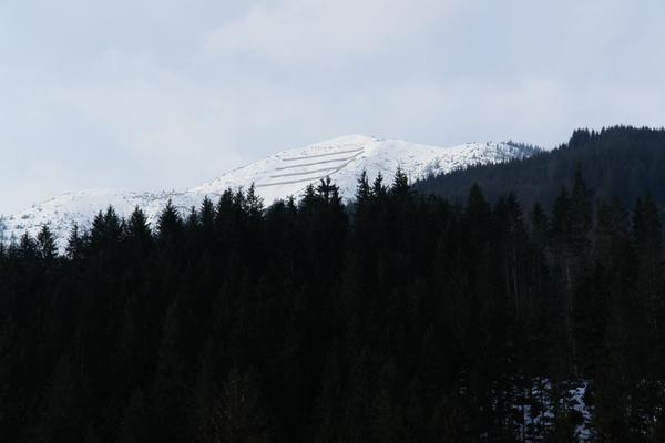 In trübem Licht zeigt sich unser heutiges Gipfelziel, knapp 1.000 Höhenmeter über unserem Ausgangspunkt. Deutlich erkennen wir die Lawinenverbauungen an den Osthängen des Pleschberg.