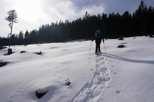 Über freie Hänge, Lichtungen und Schläge halten wir nun auf den Gipfel zu. Das GPS leistet uns bei der Orientierung gute Hilfe.