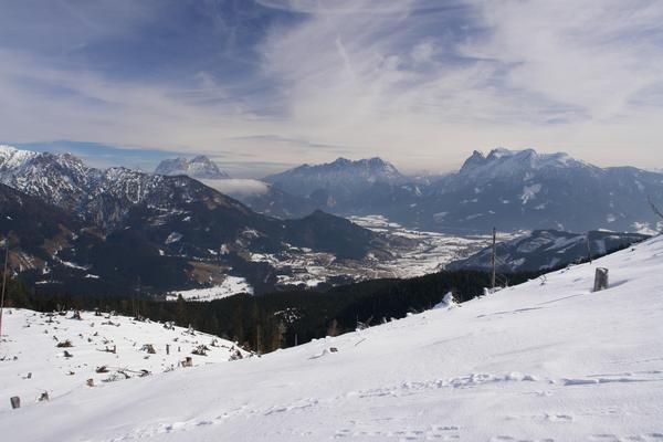 Ausblick über den Admonter Talkessel auf die Gesäuseberge (Buchsteingruppe, Hochtorgruppe und Admonter Reichensteingruppe)