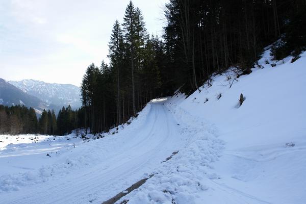 Hier wählen wir aber die geräumte Forsstraße, die in einem 180-Grad-Winkl in den Wald hinauf führt.