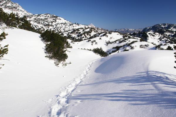 Ab der Geländekante auf das Hochplateau nimmt die Schneehöhe nun aprupt zu. Das Weiterstapfen würde schon jetzt am Morgen bei noch gefrorener Schneedecke ohne Schneeschuhe ziemlich mühsam werden. Eine Spur vom Vortag erleichtert mir das Vorwärtskommen.