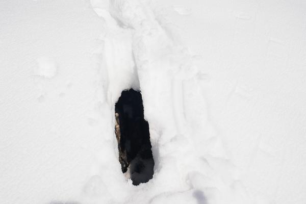 ... die sich unter der instabilen und trügerischen Schneedecke verbergen können. Bei einer ähnlichen Felsspalte habe ich mir 5 Tage später das Knie "verbogen" ...