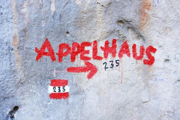 ... zurück zum Forstweg, der unweit einer Felswand mit Markierungen und ...