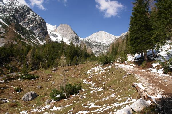 Am Vormittag noch schneebedeckt ist der unterste Wegabschnitt jetzt wieder aper. Im Hintergrund noch einmal der helle "Felsgupf" (rechts) des heute bestiegenen Sinabell.