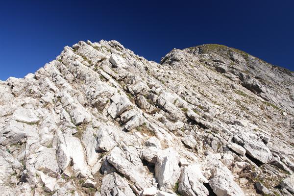 ... in der wir den Weg auf die Steirische Kalkspitze wählen. Kurze, leicht ausgesetzte Passagen im brüchigen Fels bereiten dem einen oder anderen Wanderer sichtliche Probleme.