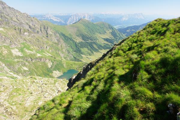Tiefblick vom schmalen Grasgrat am Stierkarkopf nach Norden zum Stierkarsee ...