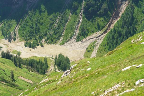 Tiefblick in den Stummerkessel, wo noch immer deutliche Spuren der Unwetter vom letzten Sommer sichtbar sind.