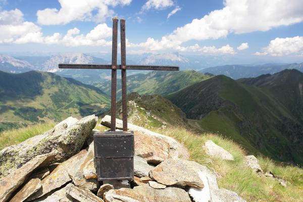 Viel mehr als 30 cm Höhe kann das kleine Gipfelkreuz am Säuleck nicht aufweisen. Entsprechend proportioniert ist auch das Gipfelbuch.