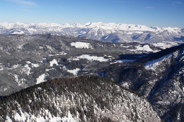 Das waldreiche Kemetgebirge zwischen Kammspitz und Bad Mitterndorf im steirischen Salzkammergut. Deutlich erkennt man freie Almflächen. Auch die Viehbergalm liegt da unten. Im Hintergrund das Tote Gebirge.