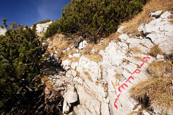 Etwa 100 Höhenmeter unter dem Gipfelkreuz erreichen wir die Weggabelung ...