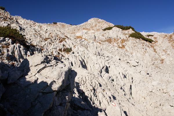 Über einige Karststufen hinweg erreiche ich wieder die Weggabelung, wo sich Ingrid mittlerweile ausgeruht und gut erholt hat.