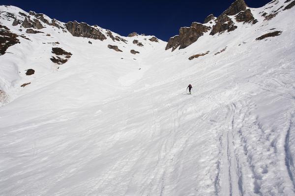 Da ich vor allem in den älteren Spuren auf den zunehmend steilen Hängen immer wieder ins Rutschen komme, lege ich meine Harscheisen an.